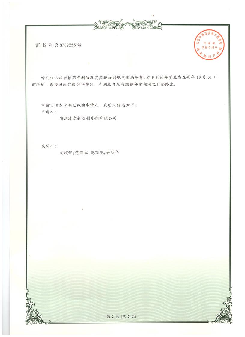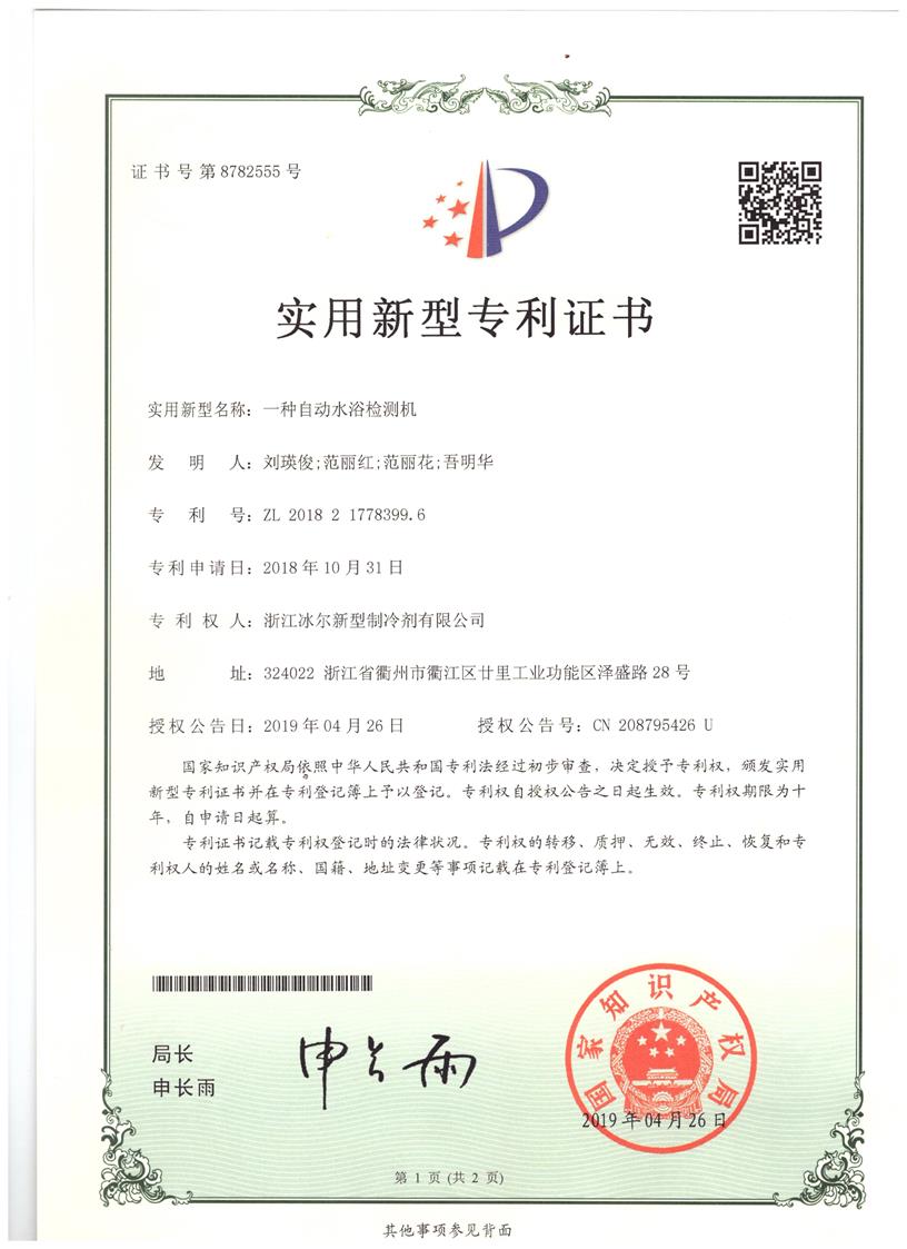 恭喜浙江冰尔新型制冷剂有限公司荣获实用新型专利证书!